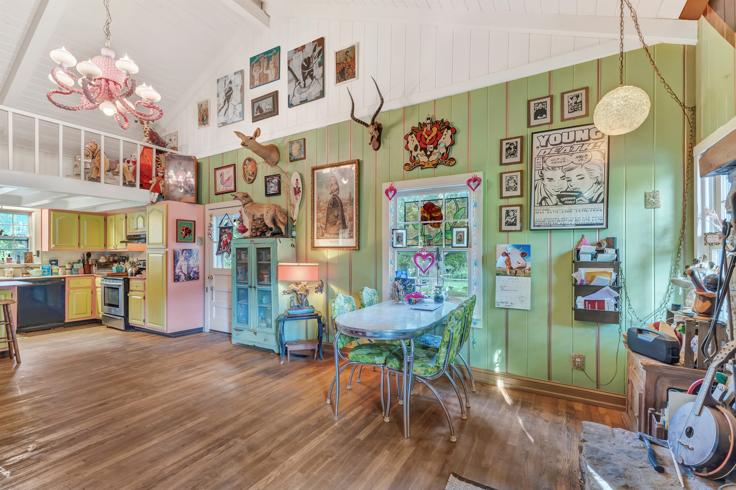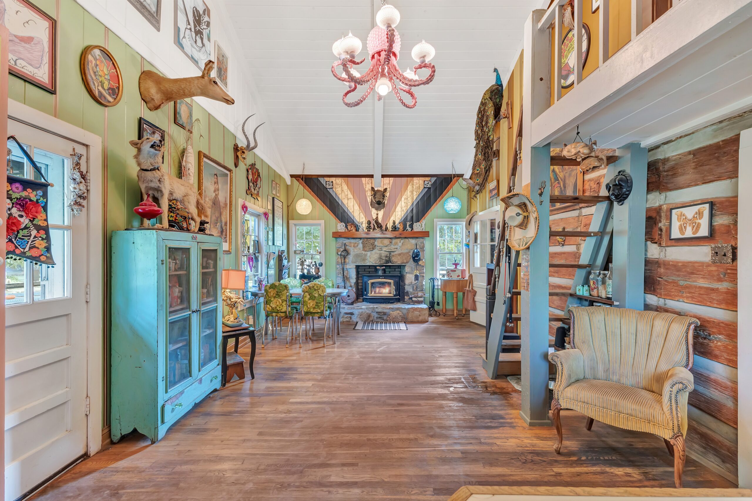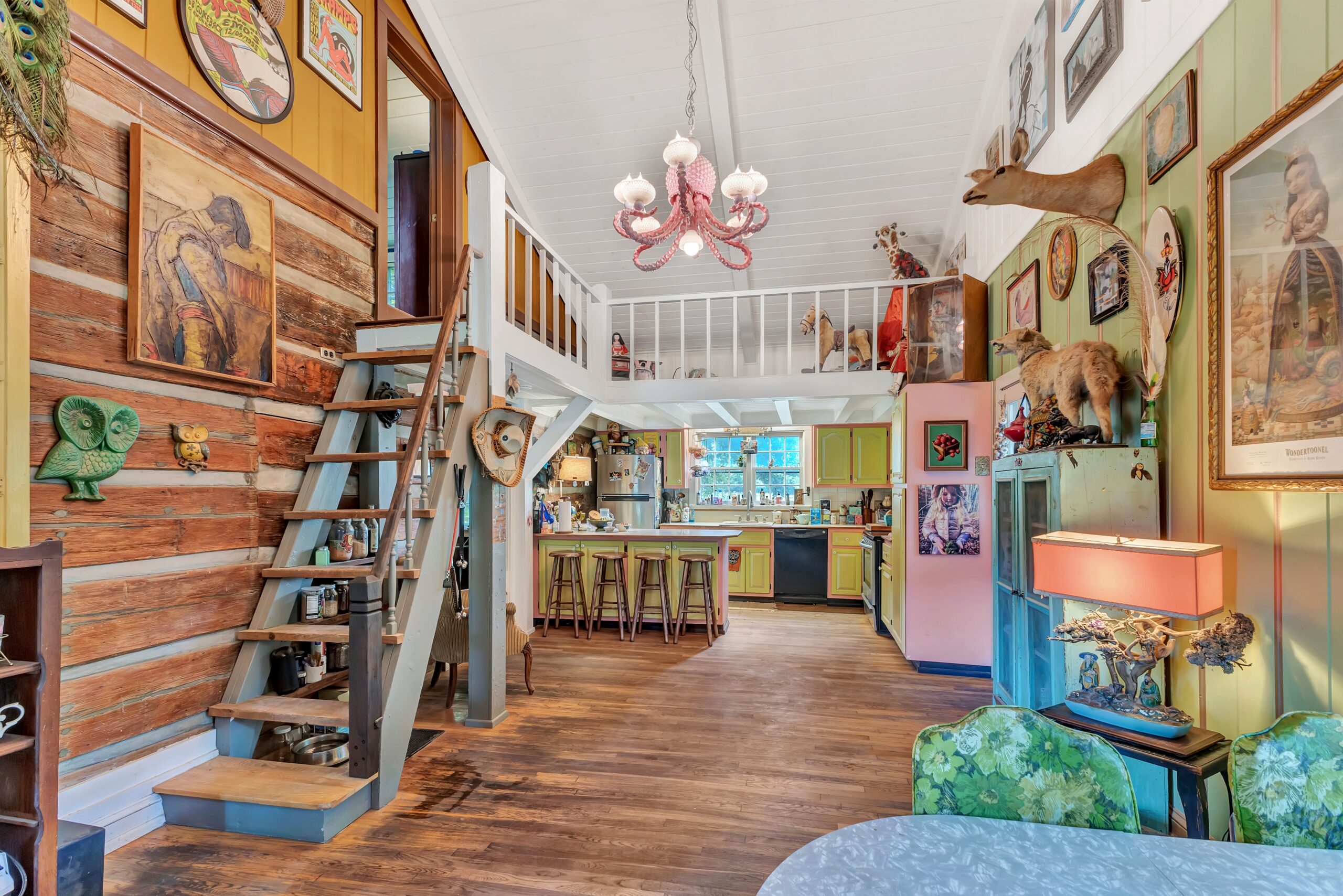 • Back addition: early 1960s vaulted ceiling; custom octopus chandelier.